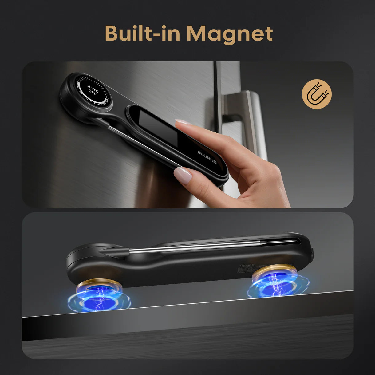 - Easy storage: two strong magnets on the back keep it handy on your fridge or grill.