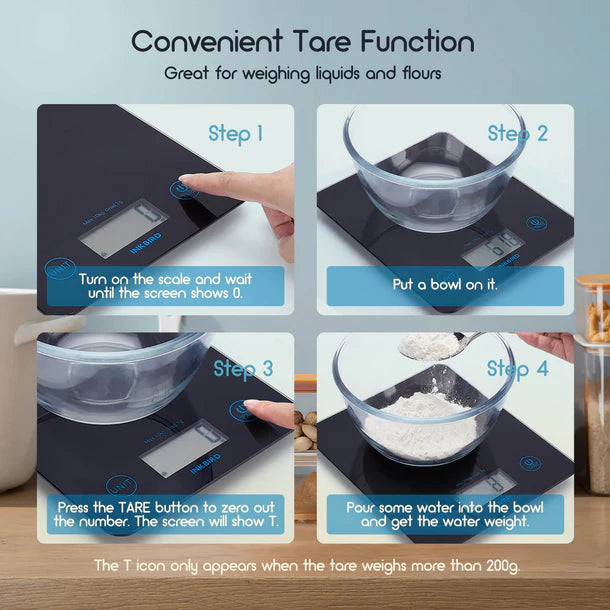 2. Add your bowl or plate and press “Tare” to reset to zero.